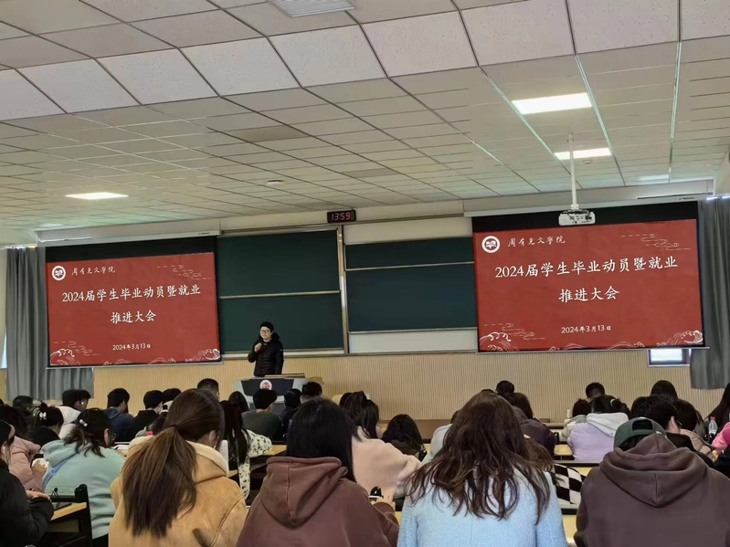 为深入贯彻落实党中央、国务院“稳就业”“保就业”的决策部署和2024届全省普通高校毕业生就业创业工作推进会的精神,全面扎实推进学院毕业生毕业及就业工作,3月13日下午,色情网 在西太湖校区立功楼5阶成功举办了2024届学生毕业动员暨就业推进大会。学院党总书记焦洁庆、院长葛金华、专业负责人付用现、中文系主任贺与诤、学工办主任张燕红、毕业班班主任刘磊、蒋碧薇及全体2020级学生参加会议,会议由学院党总支副书记颜黎光主持。